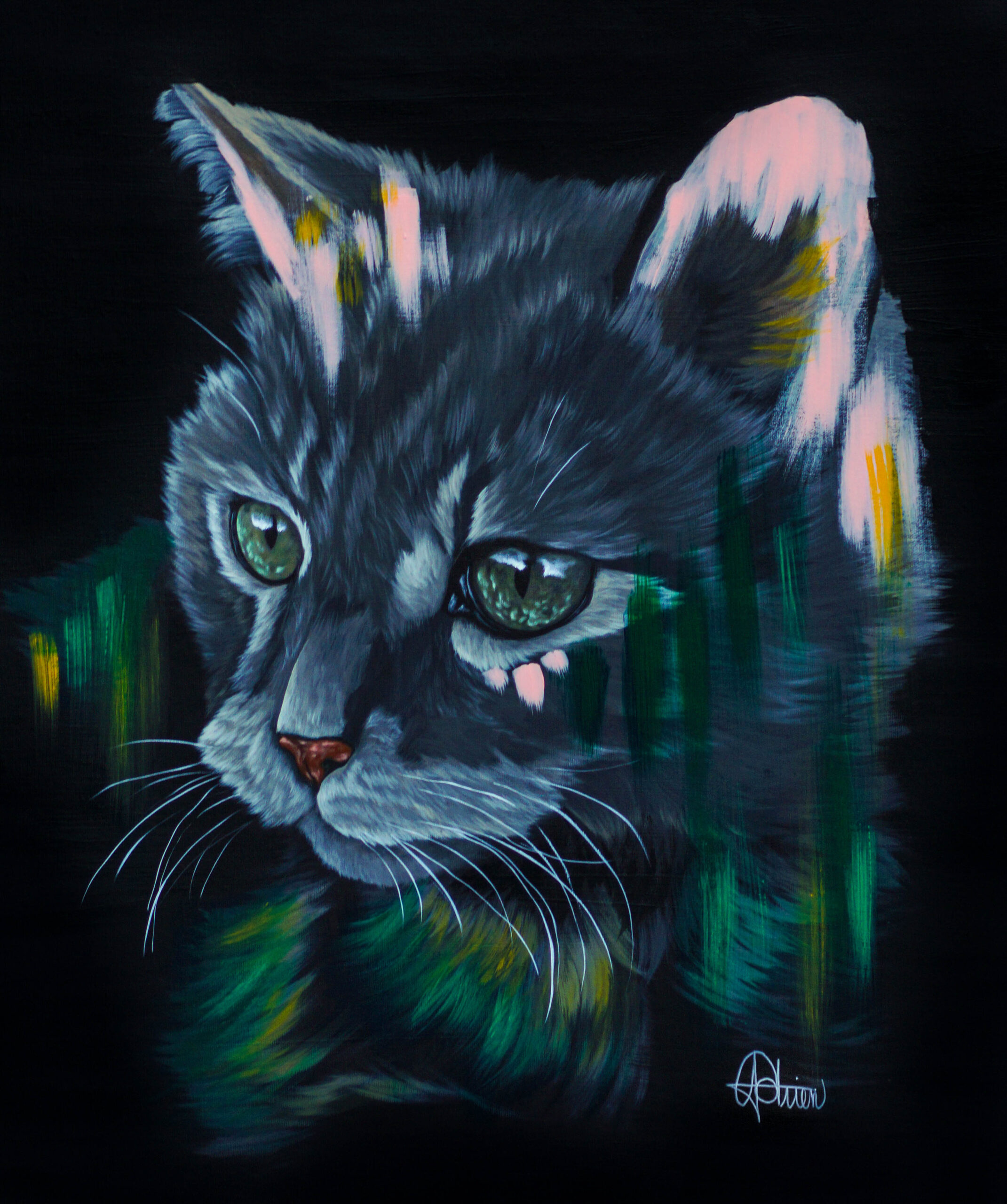 Cahier des charges : Portrait d’animal de chat sur fond noir avec traits verts et roses pale.